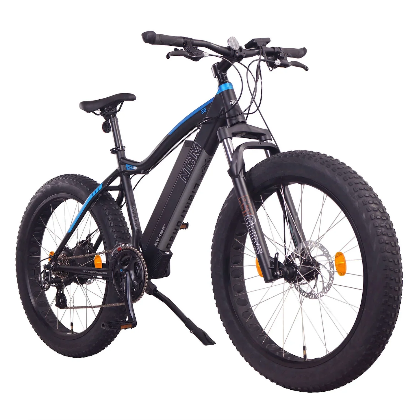 With a large tire width, the NCM Aspen is hugely capable. Developed in Iceland for riding on snow and ice the Fat bikes large tires surface area make it great for soft terrain including sand and gravel. This E-bike is designed with a tough aluminium frame, and a strong rigid handlebar and saddle for improved ergonomics and performance. The high top tube, makes the bike sturdy and strong allowing the power you put down to be effectively transferred to the road.